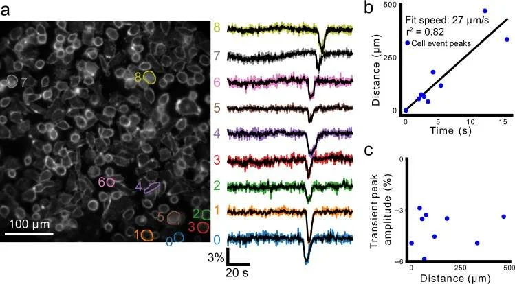 Ratiometric VSDs have been used in cancer cell lines to track hyperpolarization propagation in a population of cells (1). Regions of interest (ROIs) can be drawn around individual cells to measure fluorescence intensity changes as a function of time and distance from any chosen starting point. The speed of propagation can also be calculated.